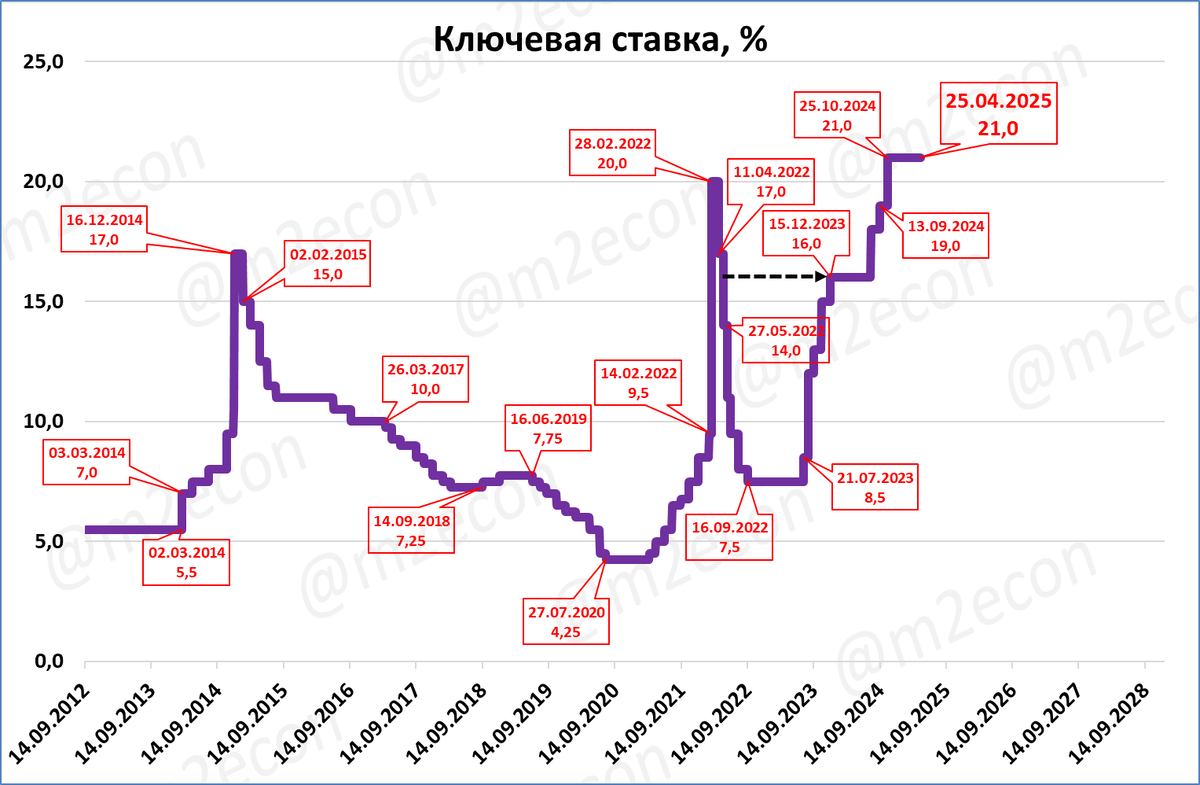 На своём заседании в пятницу 25 апреля ЦБ сохранил ставку на текущем уровне 21% годовых.