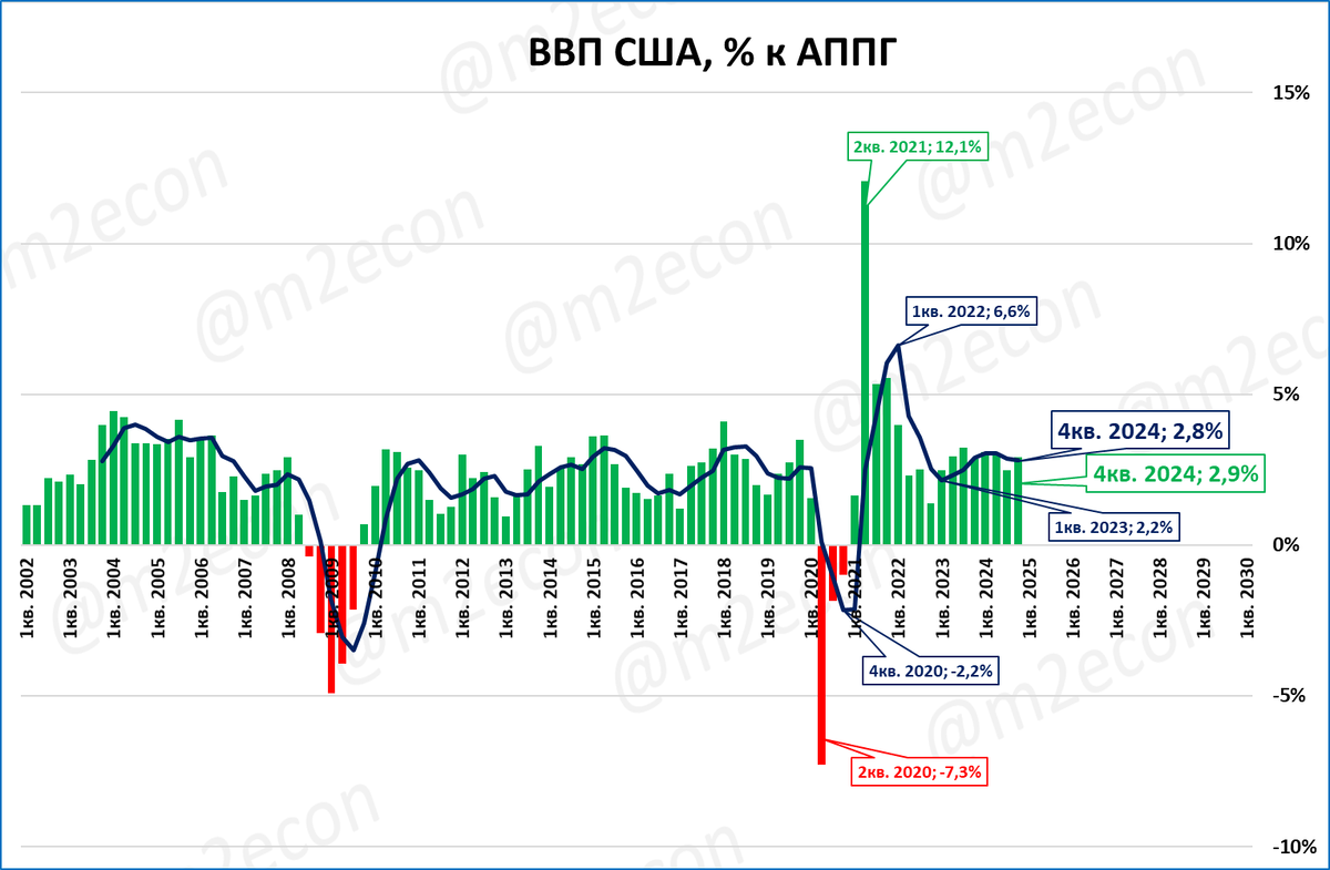 Напомним, что ВВП США в 4 квартале 2024 года вырос на 2,8%.