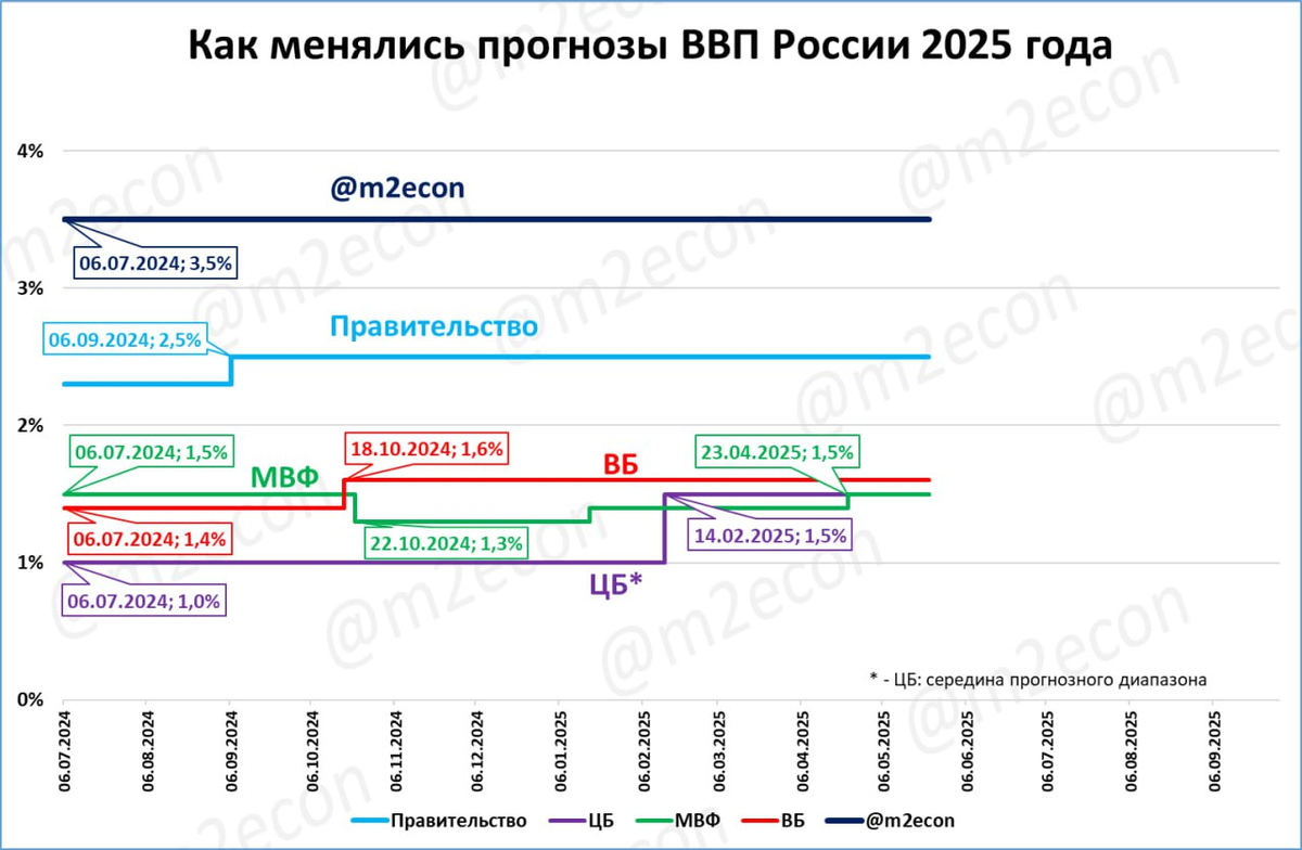 В апреле сразу несколько организаций (правительство, МВФ, ЦБ) обновили свои прогнозы по росту ВВП в России в 2025 году.