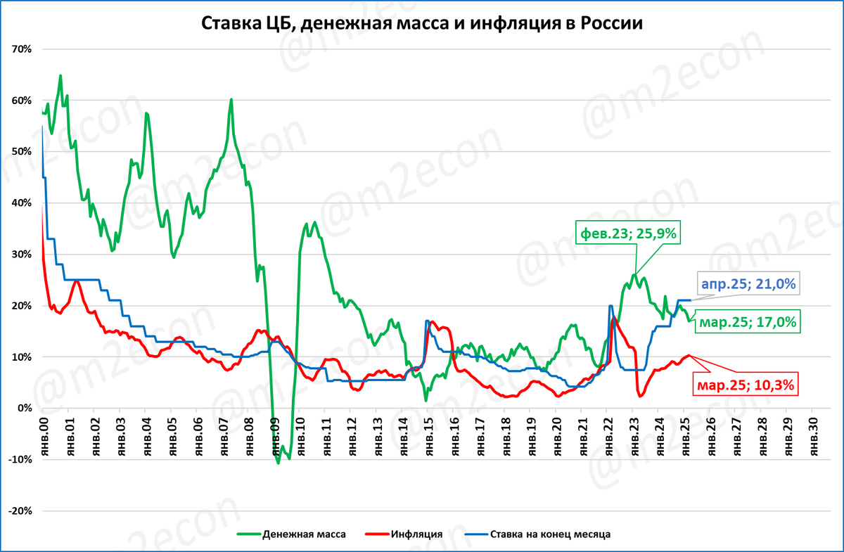 А вот с наращиванием денежной массы опережающими темпами проблемы. Темпы роста ДМ с 26% годовых в феврале 2023 года замедлились до 17% в марте 2025.