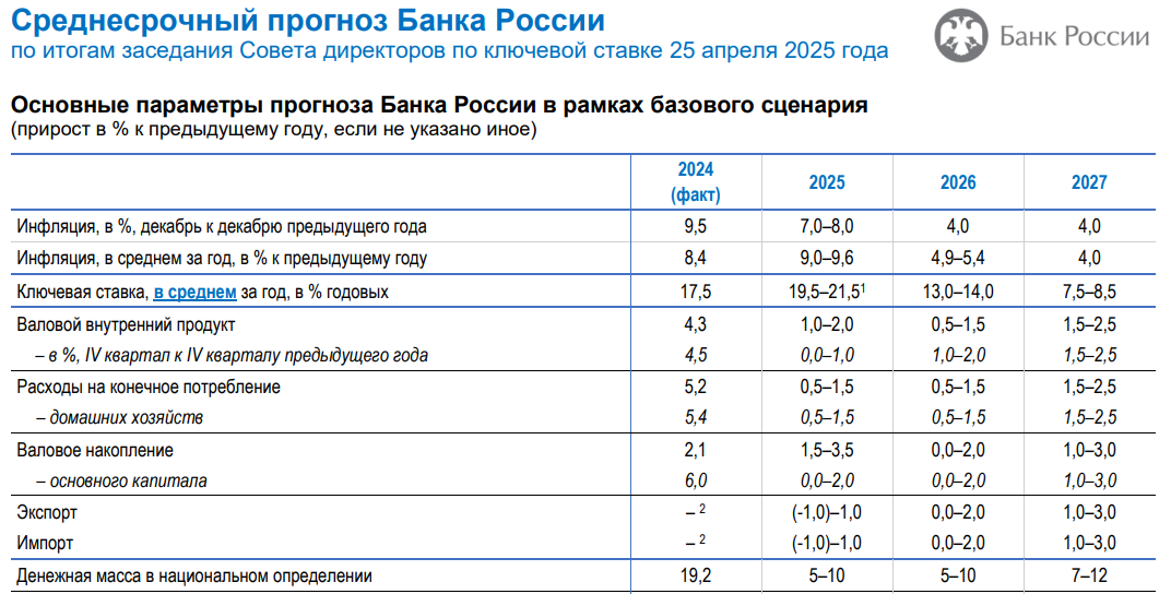 Что изменилось в прогнозах 2025 года по сравнению с предыдущим (февральским) прогнозом ЦБ? По ключевым показателям — ничего.