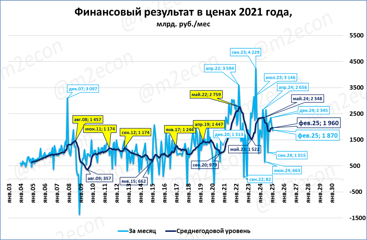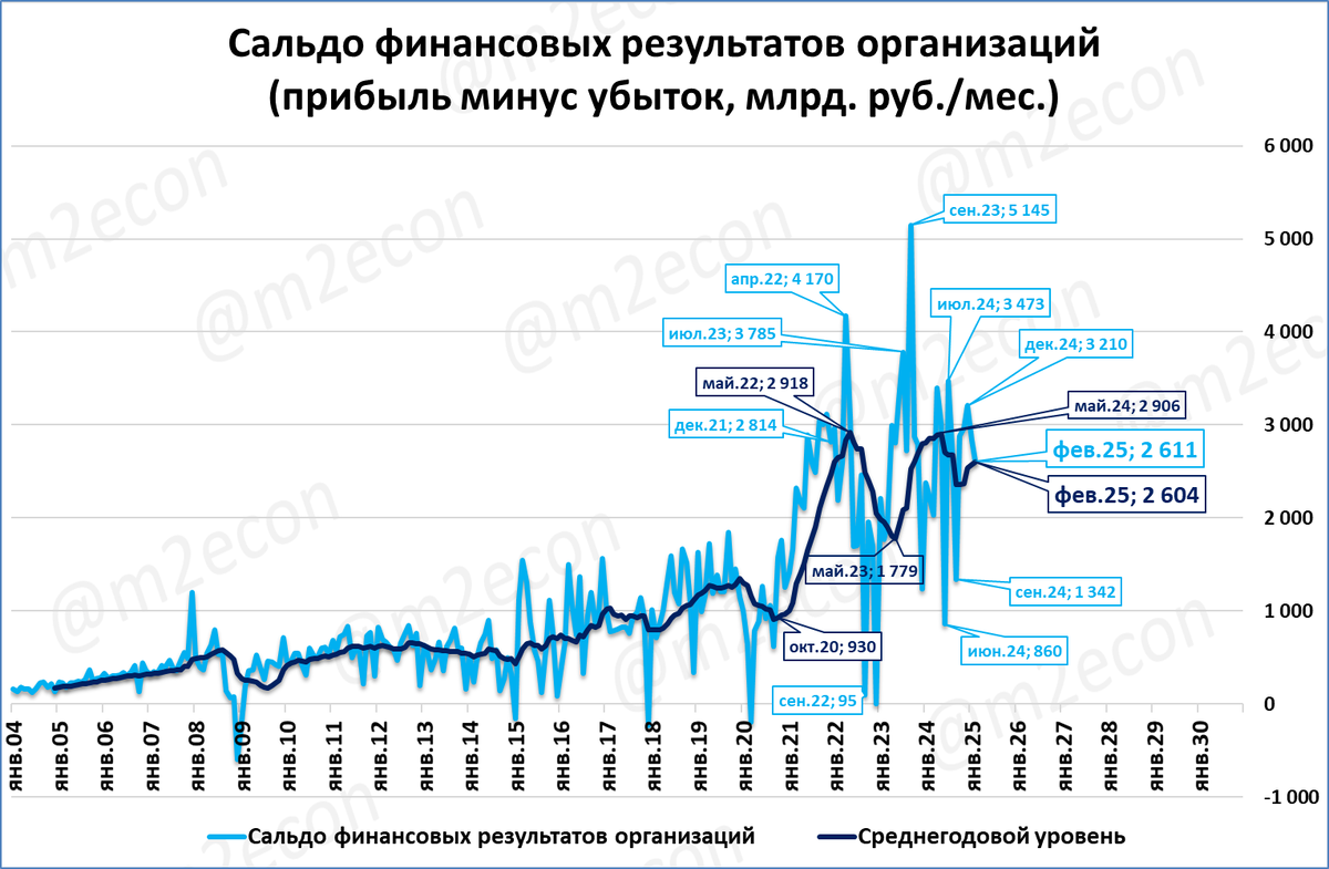 Прибыль предприятий* приросла за февраль на 2,6 трлн рублей. Не рекорд, но по историческим меркам выглядит неплохо.