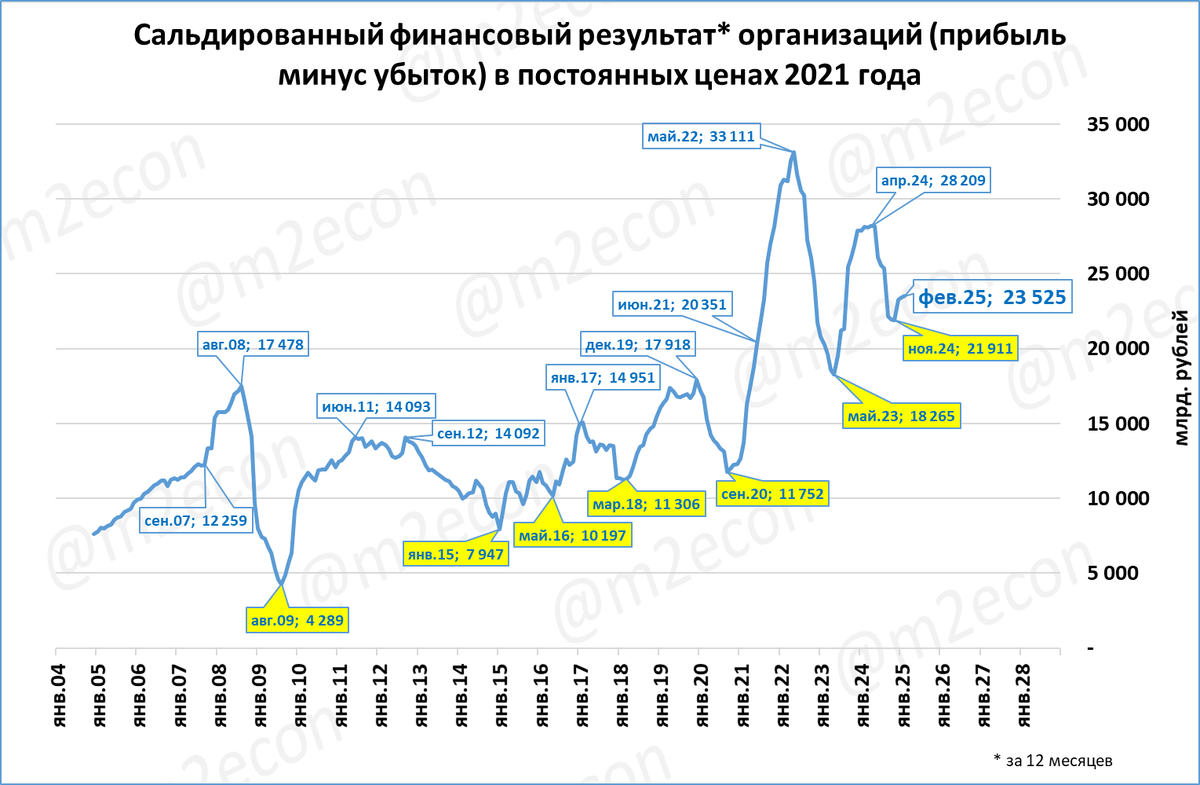 За последние 12 месяцев прибыль в реальном выражении составила порядка 23,5 трлн рублей в ценах 2021 года.