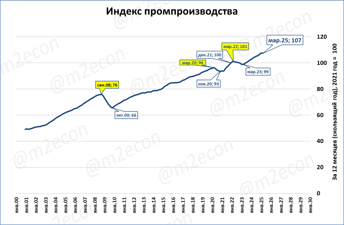 Несмотря на низкие темпы роста, показатель обновляет исторические рекорды. За последние 12 месяцев (скользящий год) объём промпроизводства составил 107% от уровня 2021 года.