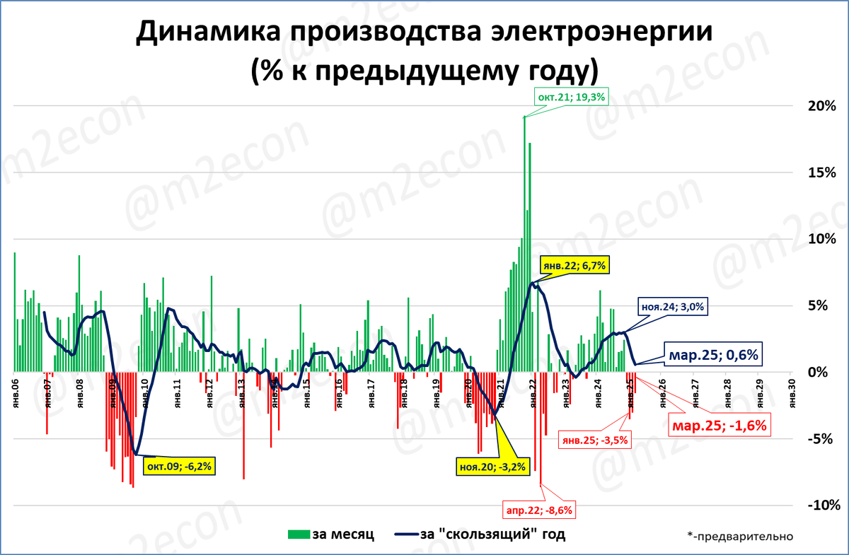 Производство электроэнергии в марте снизилось на 1,6% к марту прошлого года. Это четвёртый месяц падения подряд.