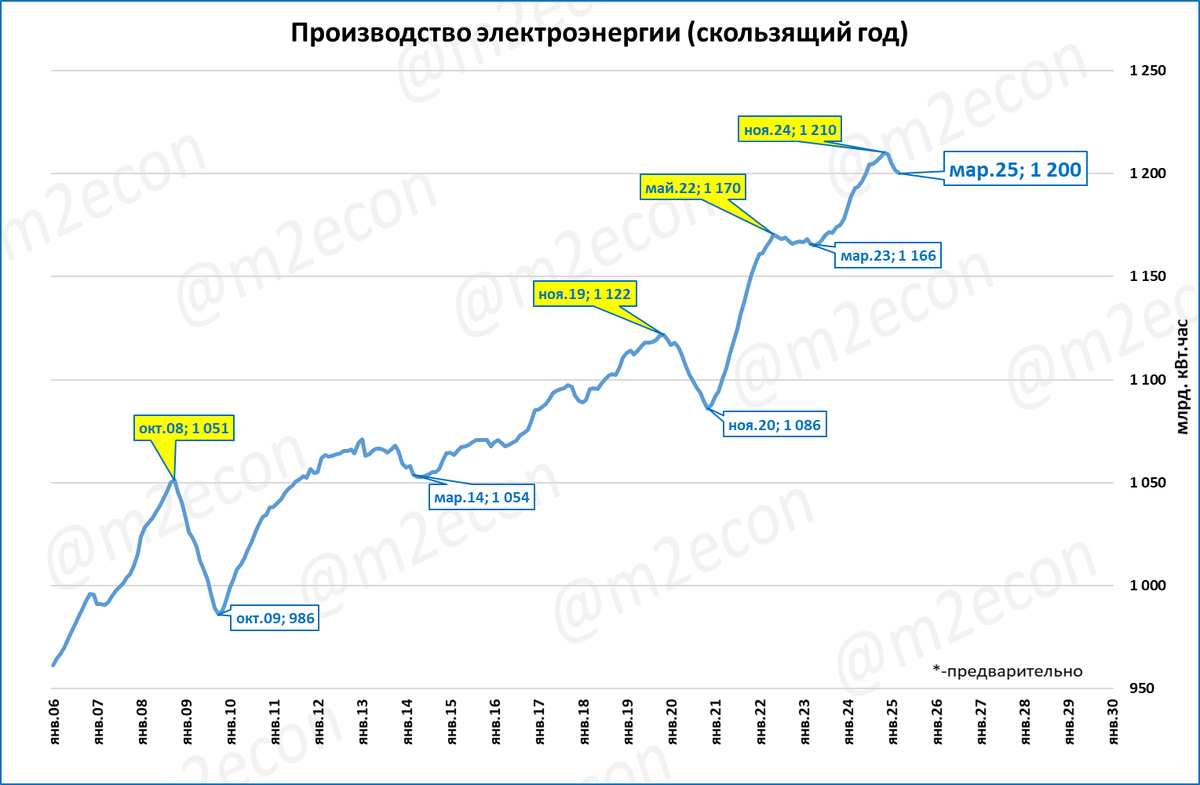 Производство электроэнергии за 12 месяцев (скользящий год) достигло максимума по итогам ноября 2024 года, и с тех пор снижается.
