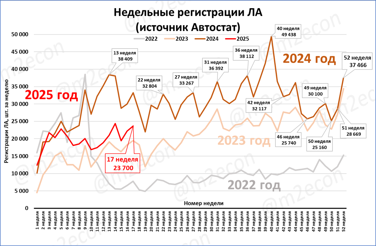 По данным агентства «Автостат», регистрации легковых автомобилей на 17 неделе составили 23,7 тыс.