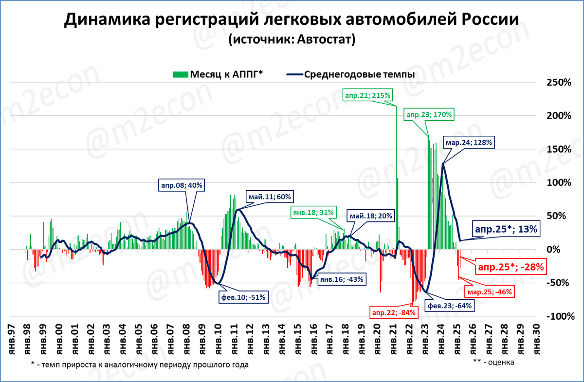 Судя по недельным данным, в апреле будет продано порядка 100 тыс. легковых автомобилей. Это -28% к апрелю прошлого года. По сравнению с мартом (-46%) темпы падения замедляются.