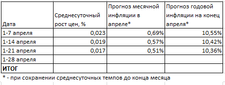 С 1 по 21 апреля среднесуточный рост цен составил 0,017%.