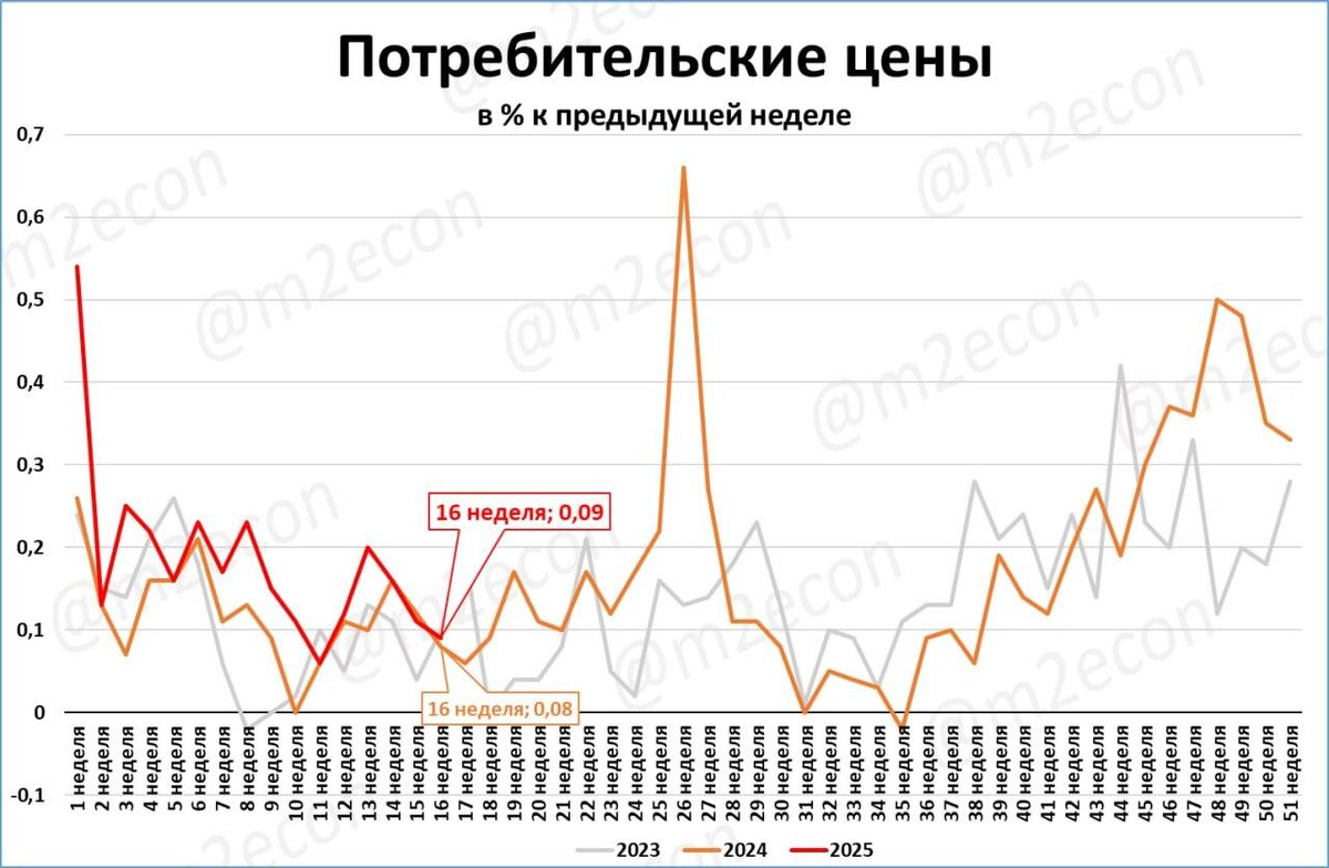 Инфляция на 13-й неделе (0,2%) заметно выше инфляции 13-й недели 2024 года (0,1%).