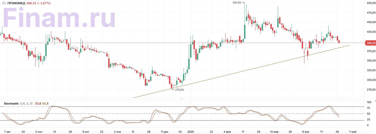 На дневном графике акций компании «Промомед» выстраивается среднесрочный восходящий тренд, при этом отсутствуют признаки технического перегрева или сигналы о развороте.
