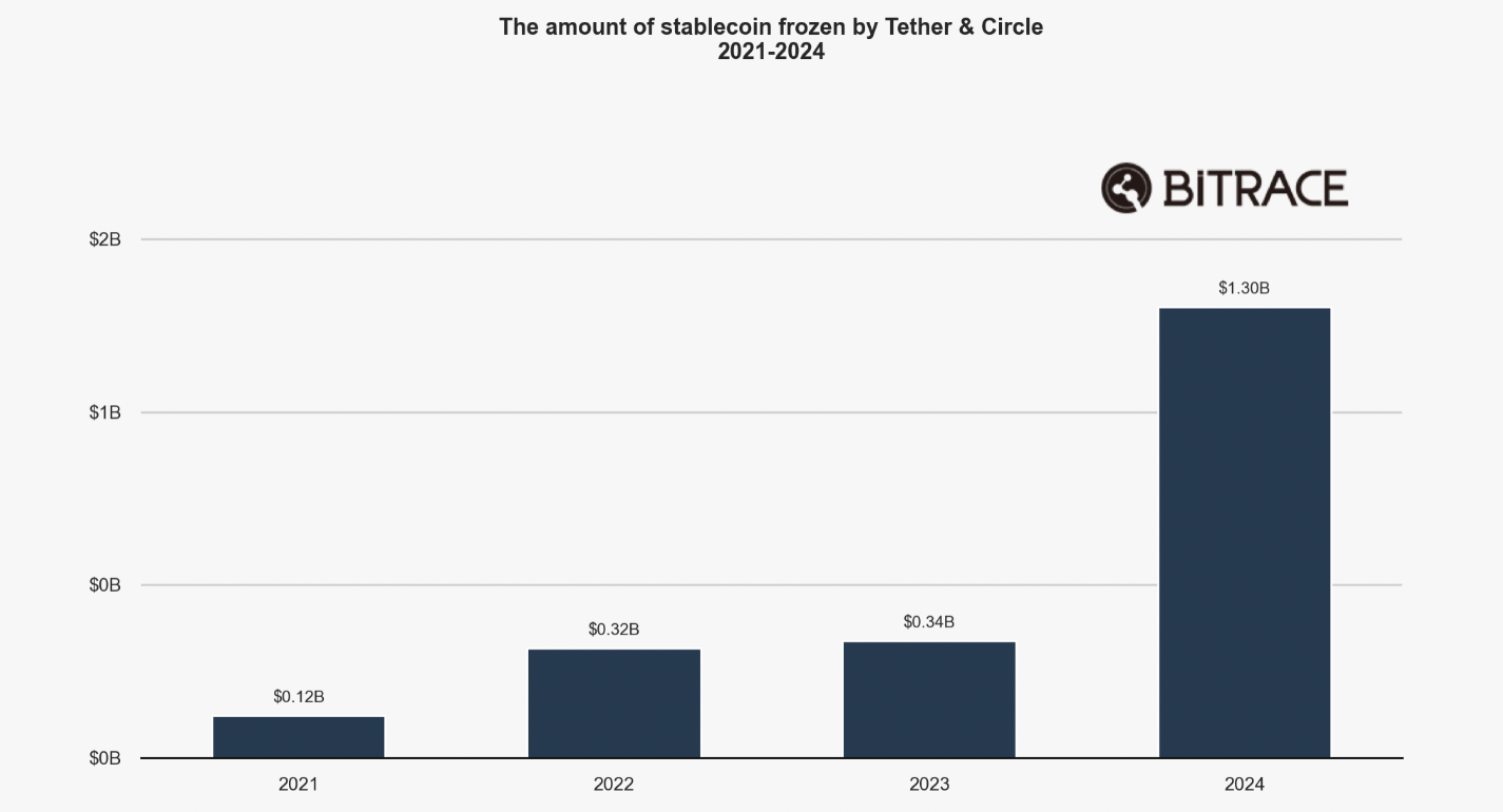 В 2024 году эмитенты Tether и Circle совокупно заморозили более $1,3 млрд, что вдвое превышает показатели последних трех лет. Объем всех транзакций по таким адресам достиг $12,9 млрд.