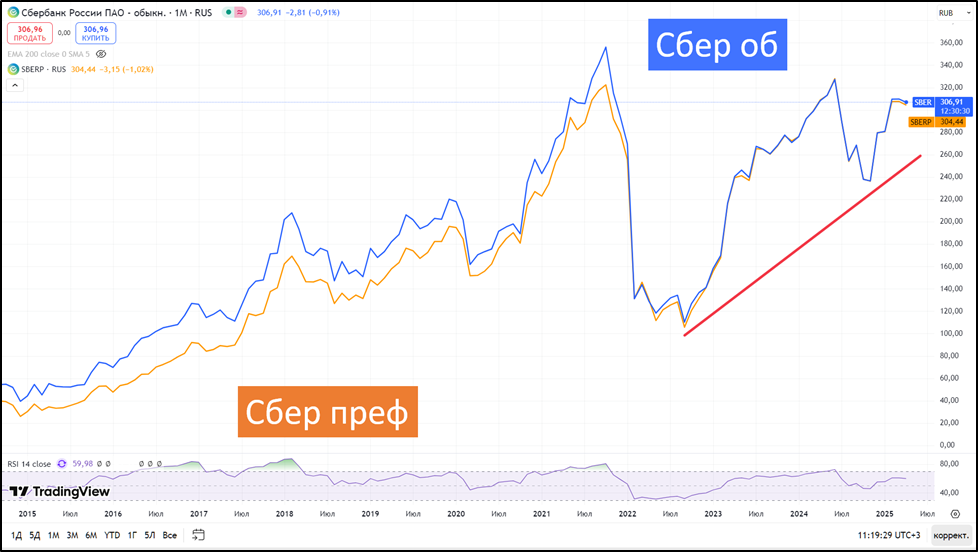 С конца 2022 года идёт растущий тренд. Но за 2024 год котировки прибавили только 3%, правда это не считая дивидендов. А с начала 2025 года акции выросли примерно на 10%.