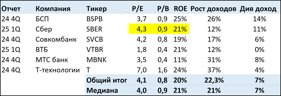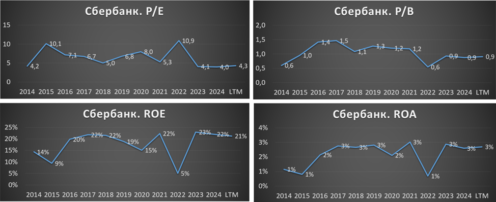P/E = 4,3; P/B = 0,9; ROE = 22%.