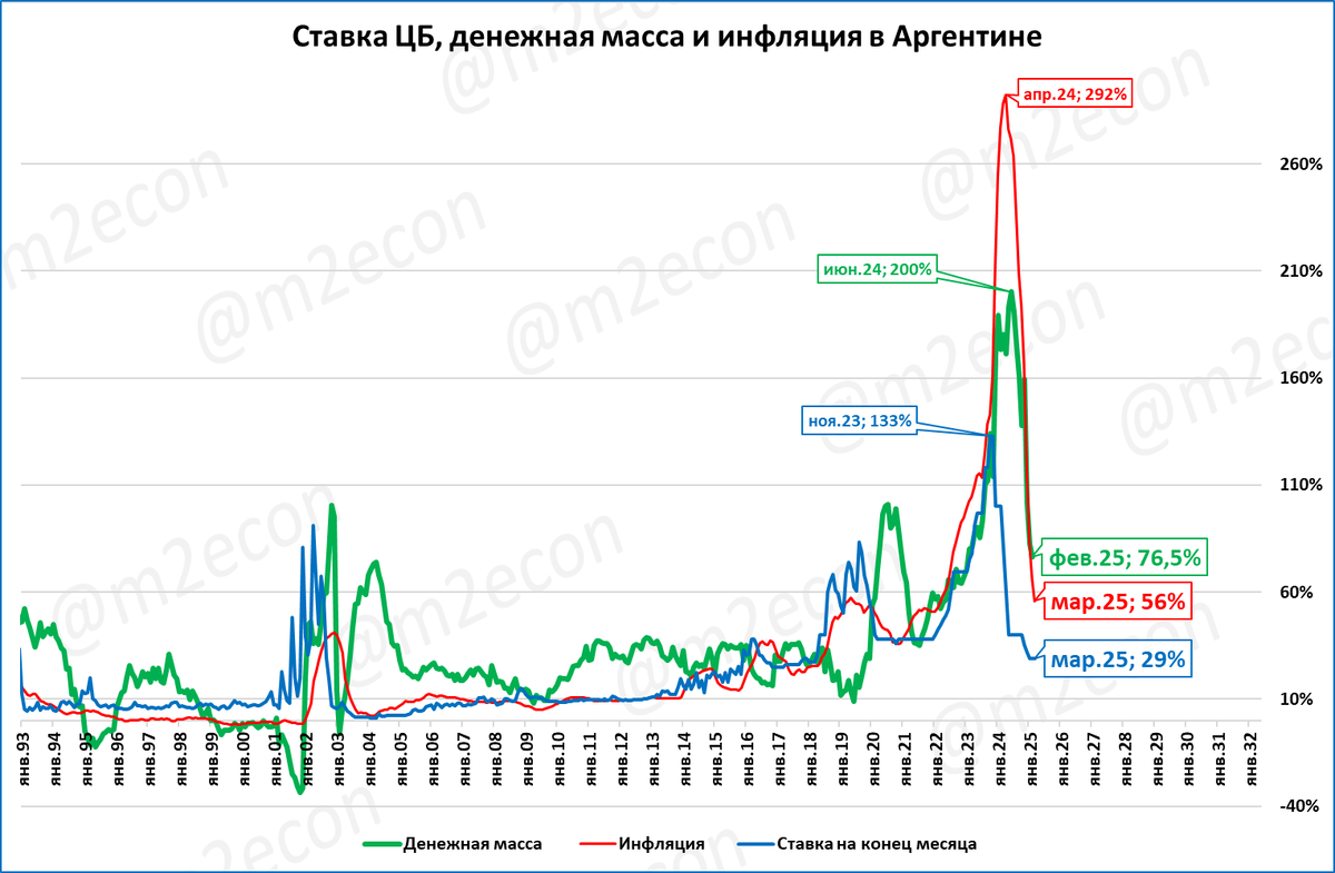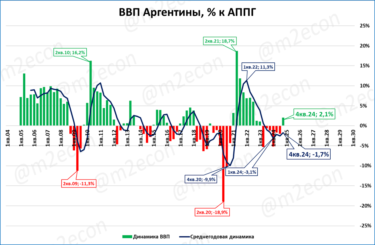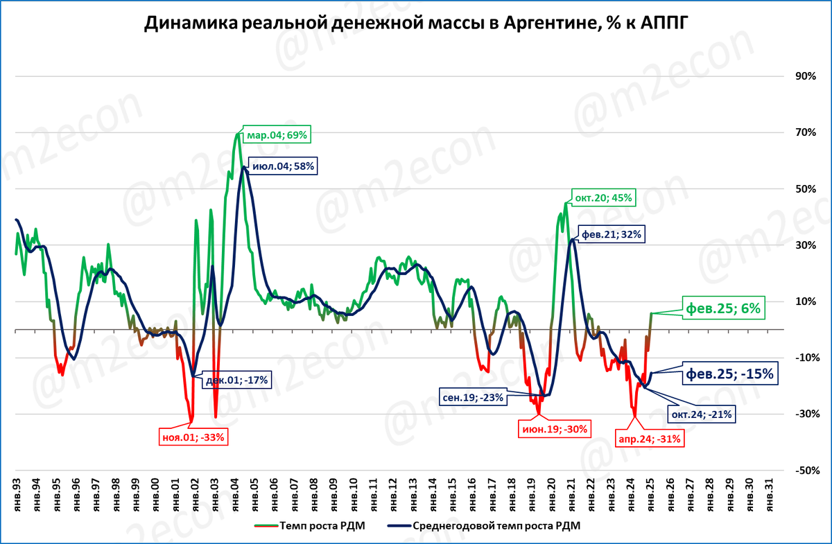 Аргентина: ВВП вырос в 4 квартале, несмотря на падение реальной денежной массы (РДМ). При этом РДМ с февраля 2025 года прекратила более чем двухлетнее падение.