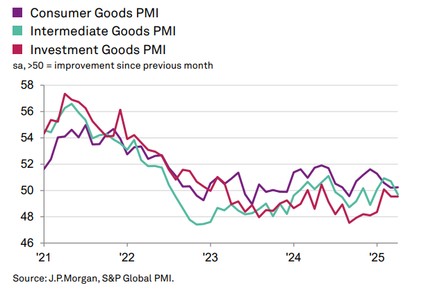 В прошлом месяце субиндекс производства инвестиционных товаров упал ниже отметки 50, пока этот показатель остается без изменений. В зоне падения оказался и субиндекс промежуточных товаров.