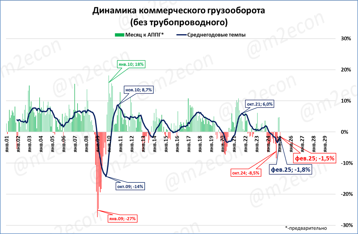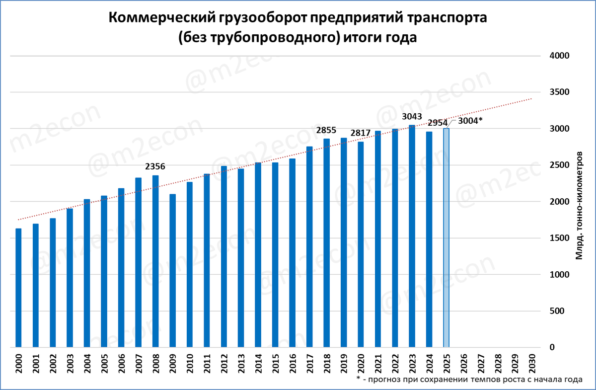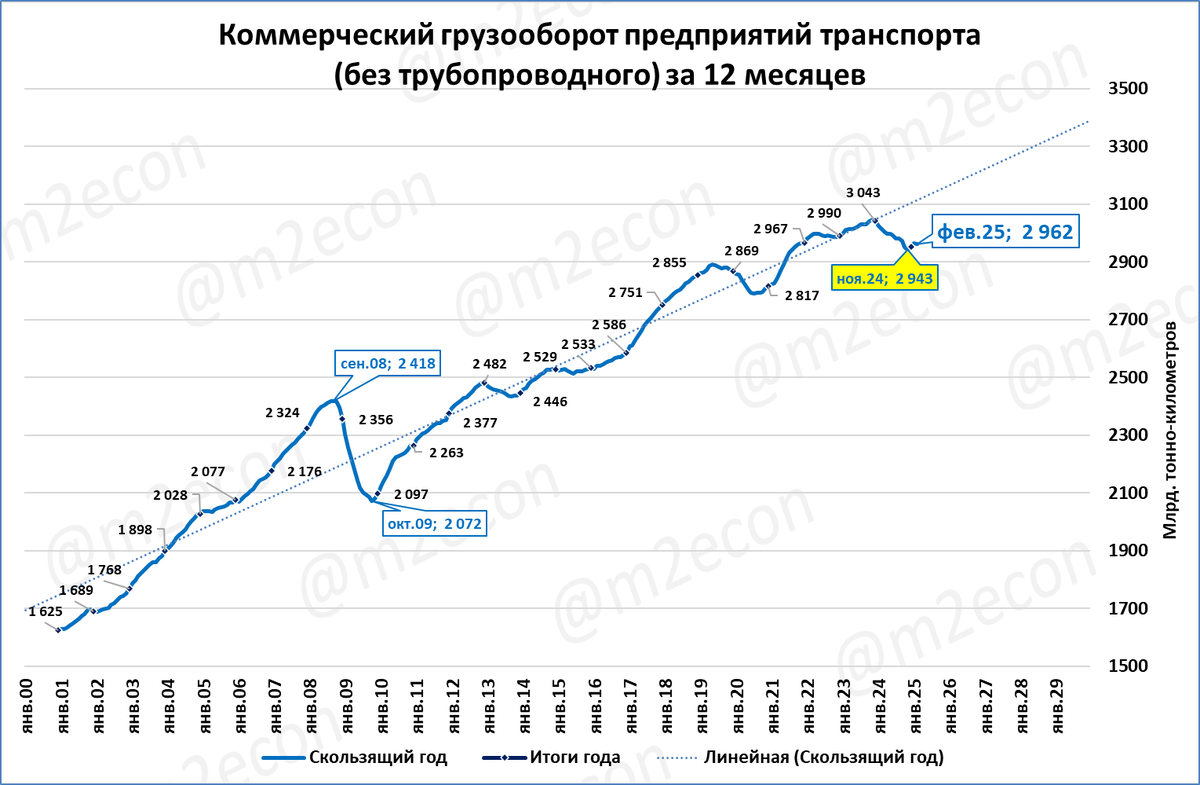 Несмотря на снижение в феврале, за два месяца 2025 года сохраняется небольшой рост (+1,7%). Если такой темп сохранится до конца года, то по его итогам грузооборот составит 3 трлн тонно-километров.