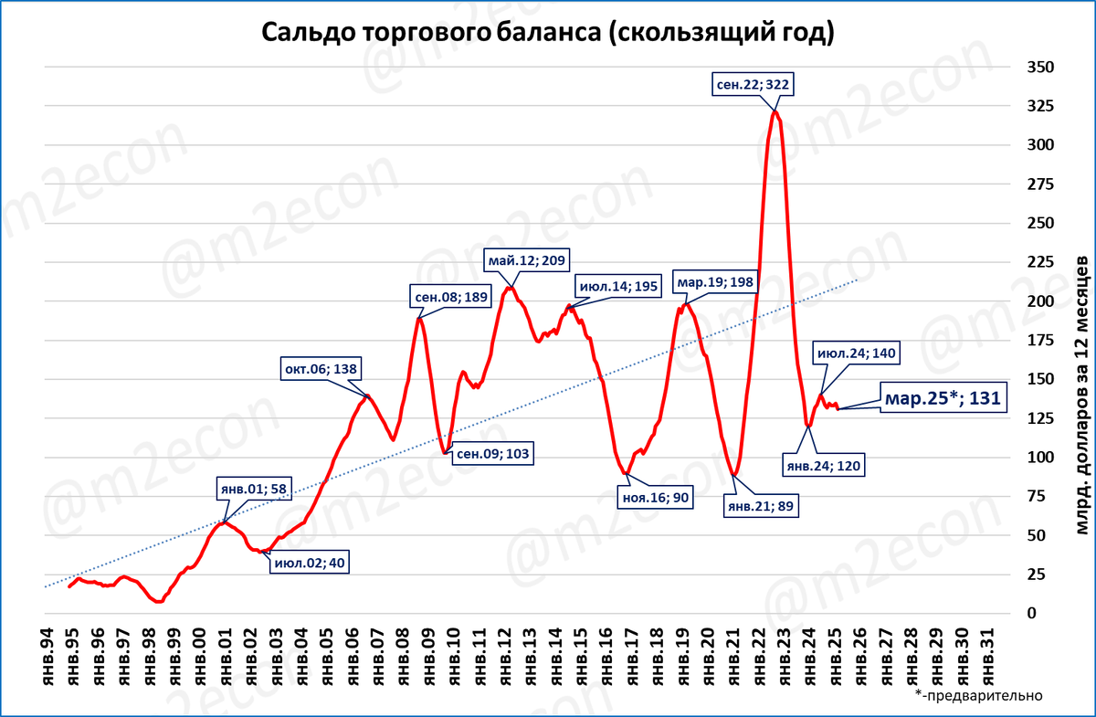 За последние 12 месяцев (скользящий год) сальдо составило 131 млрд