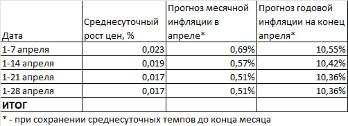 Если такой рост продлится до конца месяца, то инфляция по итогам апреля составит 10,4% годовых.