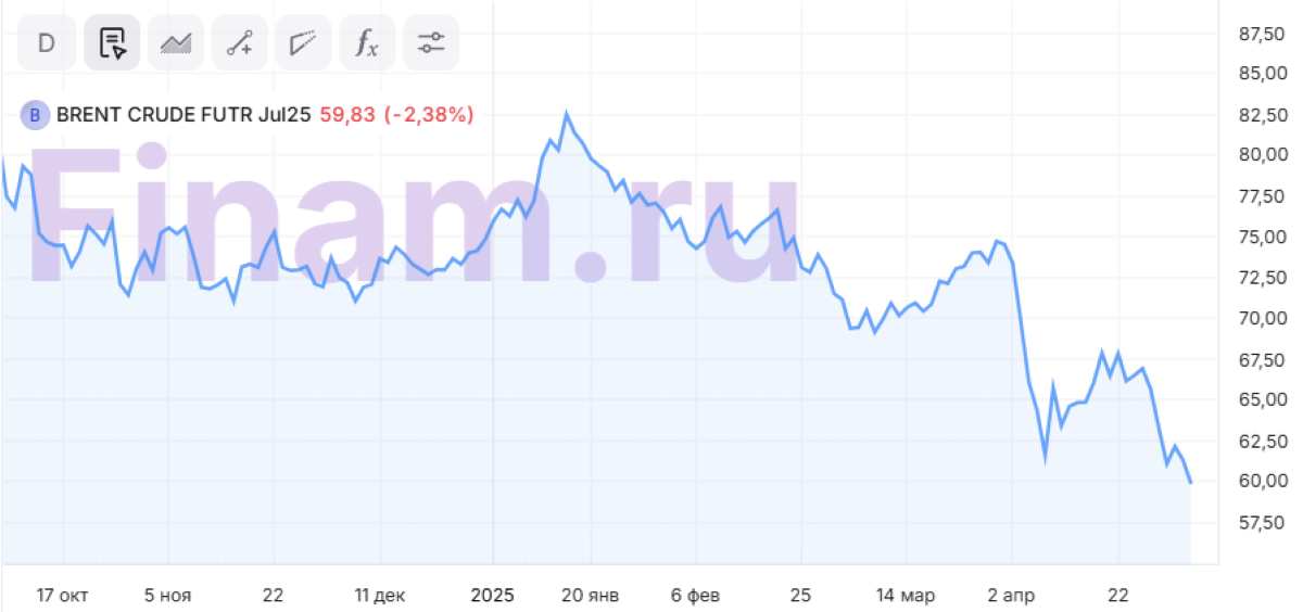 5 мая цена на нефть марки Brent падала более чем на 3%, опускаясь ниже $59 за баррель, до практически четырехлетнего минимума. Негативное давление на сырьевой рынок оказывает решение ОПЕК+ увеличить добычу в июне на 411 тысяч баррелей в сутки. Аналогичный шаг был принят и на май. Трейдеры опасаются избытка предложения из-за слабых перспектив спроса.