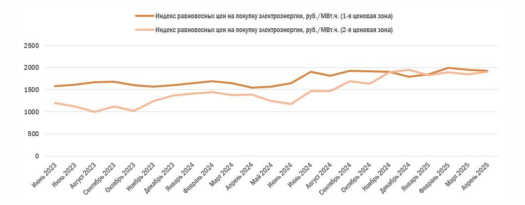 Россия: историческая помесячная динамика оптовых цен на покупку электроэнергии, 2023–2025 гг.