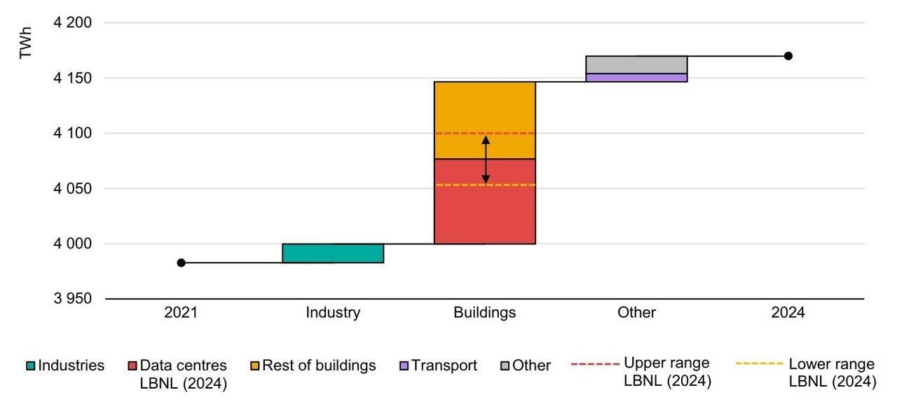 В технологическом секторе, помимо роста числа дата-центров, существенное влияние на энергопотребление оказывает развитие сетей 5G. Количество базовых станций в Китае увеличилось с 1,4 млн в 2021 году до 4,3 млн в 2025 году. По расчетам МЭА, энергопотребление телекоммуникационного сектора вырастет со 100 ТВт∙ч в 2023 году до 125 ТВт∙ч к 2030 году.