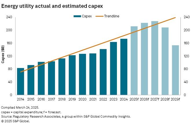 Рост энергопотребления помимо вызовов несет уникальные возможности для роста американских электроэнергетических компаний. По оценкам S&P Global, совокупный объем капитальных затрат 45 крупнейших публичных энергокомпаний США в 2024 году достигнет $187 млрд, что на 12% выше уровня 2023 года и более чем на 30% превышает показатель 2022 года. Согласно прогнозам, инвестиции будут продолжать расти: в 2025 году они могут составить $202 млрд (+8% (г/г)), в 2026 году — $206 млрд, а к 2027 году достигнут $211 млрд.