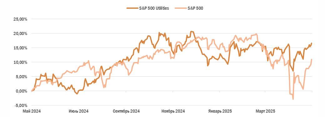 Начало весны оказалось крайне волатильным для американского фондового рынка. Хаотичная торговая политика администрации Дональда Трампа спровоцировала резкое падение ключевых биржевых индексов, которое, впрочем, было относительно быстро отыграно. На этом фоне акции электроэнергетического сектора вновь подтвердили статус защитных активов, продемонстрировав высокую устойчивость. Так, за последние 12 месяцев отраслевой индекс S&P 500 Utilities вырос на 16,6%, тогда как сам индекс S&P 500 прибавил лишь 10,9%.
