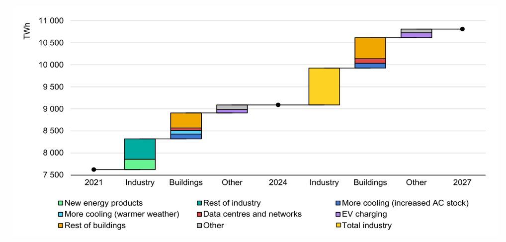 В сфере бытового потребления электроэнергии, по оценкам МЭА, важным драйвером роста спроса станет дальнейшее увеличение числа установленных кондиционеров. В настоящее время около 80% китайских домохозяйств имеют кондиционеры, тогда как в Японии и США этот показатель достигает 90%, что свидетельствует о сохраняющемся потенциале роста. Дополнительную поддержку спросу окажет дальнейшее распространение электромобилей и развитие сопутствующей инфраструктуры. По оценкам МЭА, в 2025–2027 гг. зарядная инфраструктура будет обеспечивать до 7% прироста общего спроса на электроэнергию.