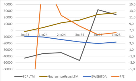 🔔Обращаю внимание на то, что чистый долг составил 73.1 млрд. руб. против 68.1 млрд. по итогу 1 кв. 2023, таким образом, приобретение «Монетки» и «Улыбки радуги» уже (!) практически окупились. Интересно, но по мультипликаторам привлекательность компании только растёт. Компания купила «Монетку» 2.10.2023 года, следовательно, показатели LTM по итогам 3 кварталов 2024 уже полностью учитывают эффект такого приобретения. EV/EBITDA на сегодня составляет 3.4, а на конец 3кв24 – те же 3.4, несмотря на рост цены бумаги с 1120 до 1450 руб. Мультипликатор P/E существенно снизился и составил 6.3 против 8.3, опять же, несмотря на рост цены бумаги.