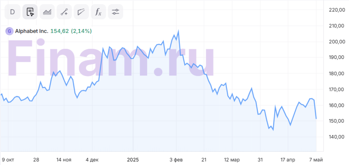 По результатам 1К 2025 совокупная выручка Alphabet выросла на 12% г/г и составила $90,2 млрд, что оказалось выше консенсус-прогноза Refinitiv в $89,1 млрд. Квартальная чистая прибыль на акцию выросла на 46% г/г, до $2,81, при консенсус-прогнозе $2,01. Однако около $8 млрд в чистой прибыли приходится на положительную переоценку финансовых активов. Без этой переоценки прибыль на акцию составила $2,27, что все еще выше консенсуса.