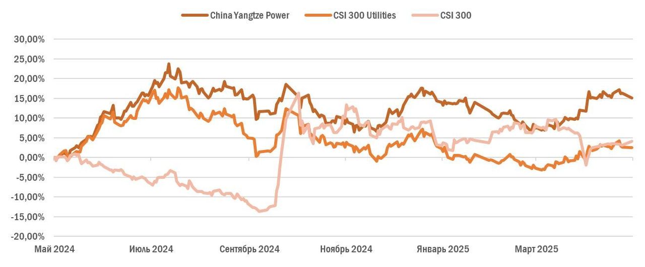Акции China Yangtze Power за последние 12 месяцев показали уверенную динамику. Бумаги компании подорожали на 15,1%, в то время как отраслевой индекс CSI 300 Utilities вырос лишь на 2,5%, а индекс широкого рынка CSI 300 — на 4,1%. Мы связываем такую динамику с сохраняющимися проблемами в китайской экономике, что способствует перераспределению капитала инвесторов в защитные активы, такие как акции China Yangtze Power. Особенно заметен рост котировок в начале апреля — на фоне снижения китайского фондового рынка, вызванного обострением торгового конфликта между Пекином и Вашингтоном.