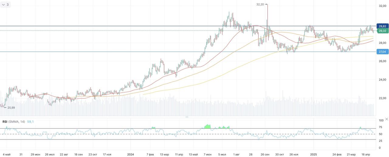 На дневном графике видно, что котировки China Yangtze Power уже более полугода торгуются в широком боковом коридоре в диапазоне CNY 27–30. Недавно акции предприняли очередную попытку пробить верхнюю границу диапазона, однако затем перешли к консолидации вблизи этого уровня. В случае уверенного выхода выше CNY 30 откроется потенциал роста в направлении исторических максимумов на отметке CNY 32,3.