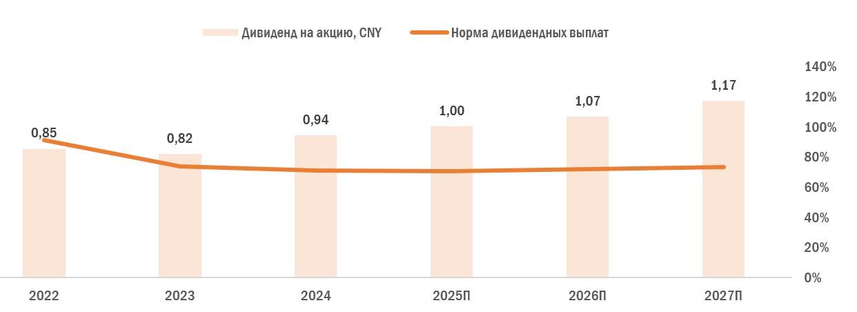 China Yangtze Power является относительно стабильным плательщиком дивидендов, поддерживая коэффициент выплат на уровне вблизи 70–80% от чистой прибыли. Мы ожидаем, что в ближайшие 12 месяцев компания выплатит около CNY 1,0 на акцию в виде дивидендов, что предполагает дивидендную доходность 3,4%.