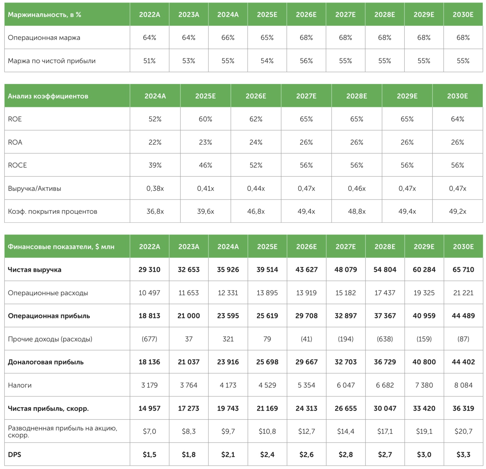 За последний отчетный квартал Visa провела buy back на сумму $4,5 млрд и одобрила новую программу обратного выкупа объемом $30 млрд. Операционная маржинальность бизнеса остается на высоком уровне, рост EPS в текущем финансовом году ожидается в пределах низких двузначных чисел. Модель компании характеризуется небольшой капиталоемкостью и высокими денежными потоками, что позволяет стабильно возвращать средства акционерам без ущерба для инвестиций в ключевую инфраструктуру.