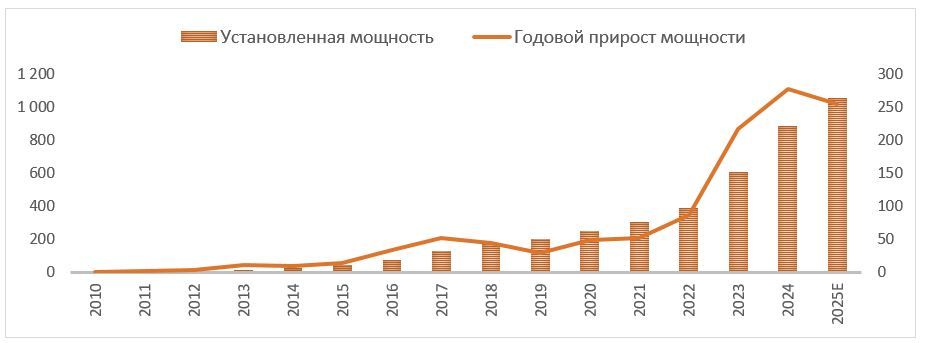 Динамика мощностей в сфере солнечной энергетики в Китае, ГВт