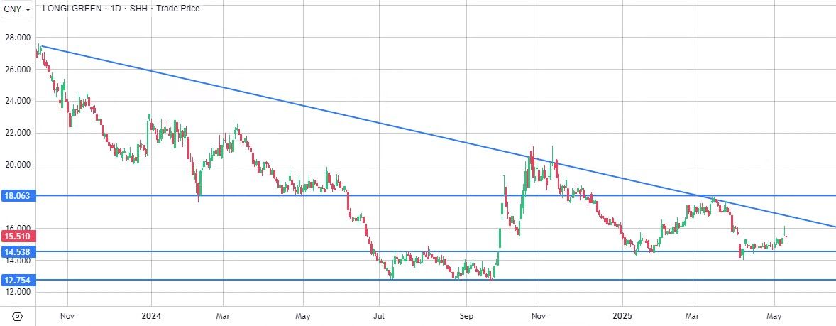 С технической точки зрения на дневном графике акции LONGi Green Energy торгуются в рамках среднесрочного нисходящего тренда. Ключевая поддержка на данный момент расположена у отметки RMB 14,5, в то время как сопротивлениями выступают линия нисходящего тренда и уровень RMB 18,0.
