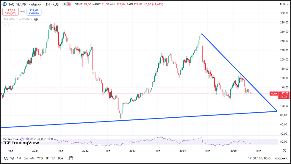 За 2024 год акции НЛМК упали на 17%. В текущем году тенденция продолжилась, акции снижаются еще на 14%. На рисунке видно, что нисходящий тренд уже длится около года.