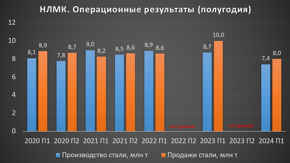 В первом полугодии динамика спроса на сталь и сталелитейную продукцию оставалась стабильной во всех основных для металлургии отраслях экономики (строительство, машиностроение, ТЭК). Но НЛМК сократил производственные показатели на фоне продажи сортовых активов в 2023 году.