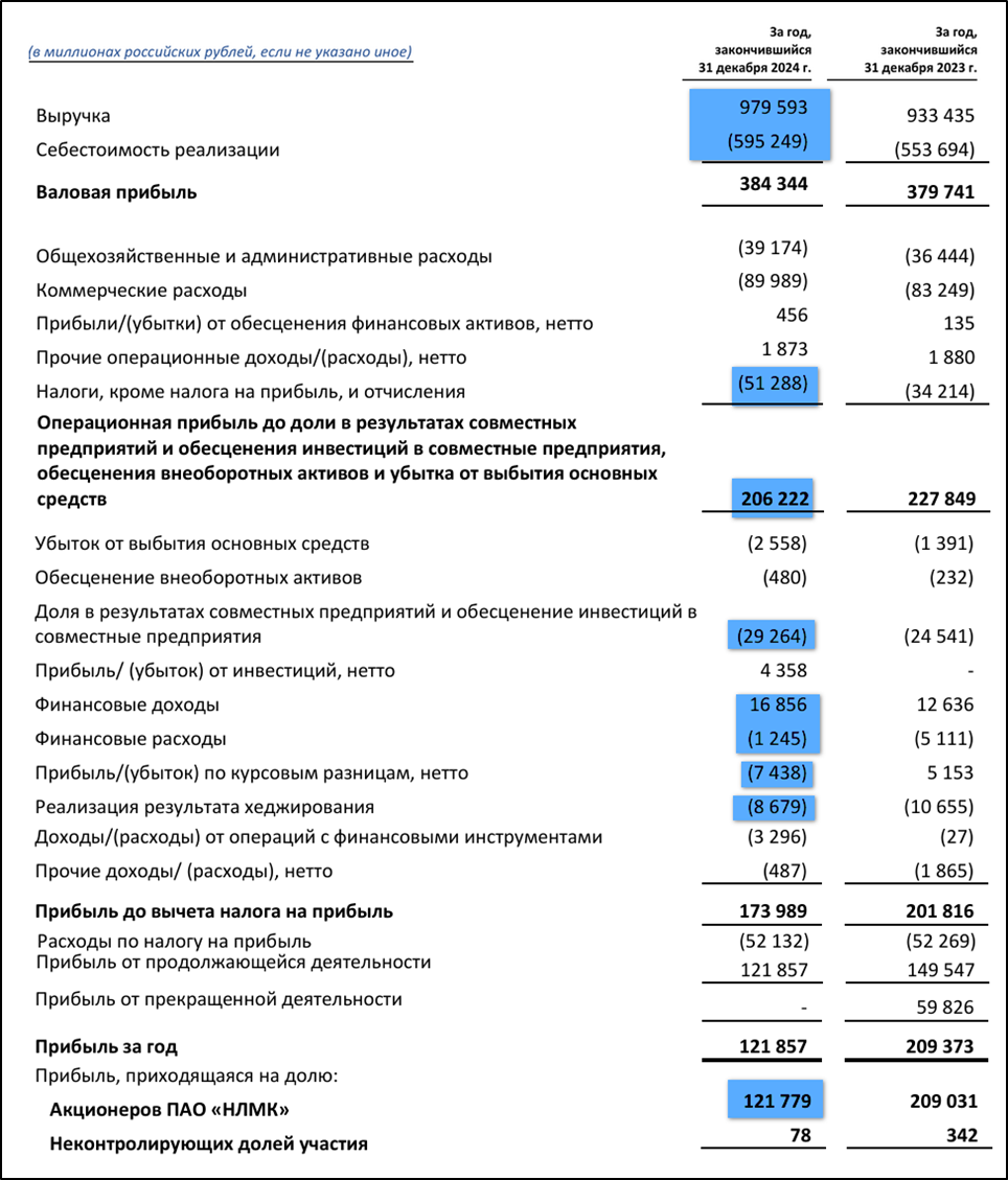 Выручка +5% в основном за счет девальвации рубля. Но себестоимость и остальные расходы показали немного опережающую динамику на фоне роста инфляции. У НЛМК положительная разница финансовых доходов и расходов, но она полностью нивелирована отрицательными курсовыми разницами и результатам хеджирования. Ещё компания отразила 29 млрд убытка от результата совместных предприятий. А также 10 млрд бумажного убытка от изменения ставки налога на прибыль. В итоге, ЧП снизилась на 42%.