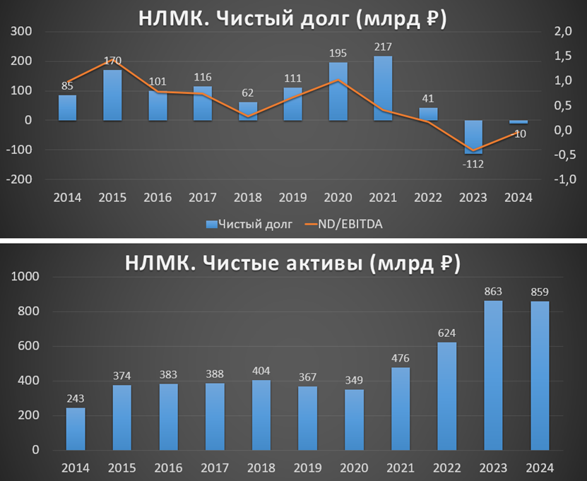 Мировые цены на сталь снижаются. Финансовые результаты за 2024 год слабые. Выручка немного подросла, но чистая прибыль упала на 42%. Чистый долг отрицательный. Свободный денежный поток на 40% хуже г/г.