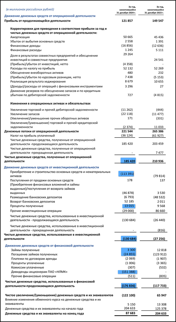 инвестиционная деятельность -130 млрд (+4,5х г/г). Капитальные затраты составили 113 млрд. Также НЛМК получил 13 млрд процентов по депозитам.