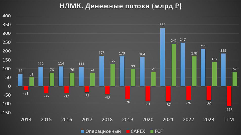 Операционный поток в прошлом году минимальный за последние 4 года, кап затраты рекордные, в итоге свободный денежный поток, который важен при определении дивидендов FCF = 82 млрд (-40% г/г).