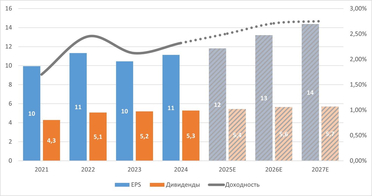 Чистая прибыль акционеров составила $1,6 млрд (-0,9% г/г) за 1К 2025, EPS продемонстрировал рост на 0,74% г/г, до $2,71. По итогам 2024 года чистая прибыль увеличилась на 6%, до $6,7 млрд.