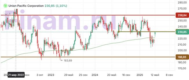 С технической точки зрения на недельном графике акции UNP движутся в диапазоне $183-258. Зоной сопротивления может выступать верхняя граница диапазона $258, а зоной поддержки — нижняя ($183). Также с 2023 года зоной поддержки выступала 200-недельная скользящая средняя. Сейчас цена подошла к зеркальному уровню $230, если сможет закрепиться выше этого, то может пойти к верхней границе диапазона в $258.