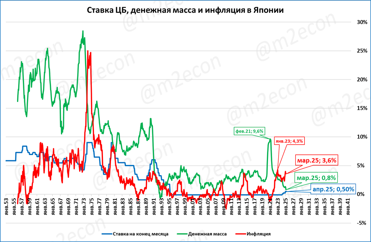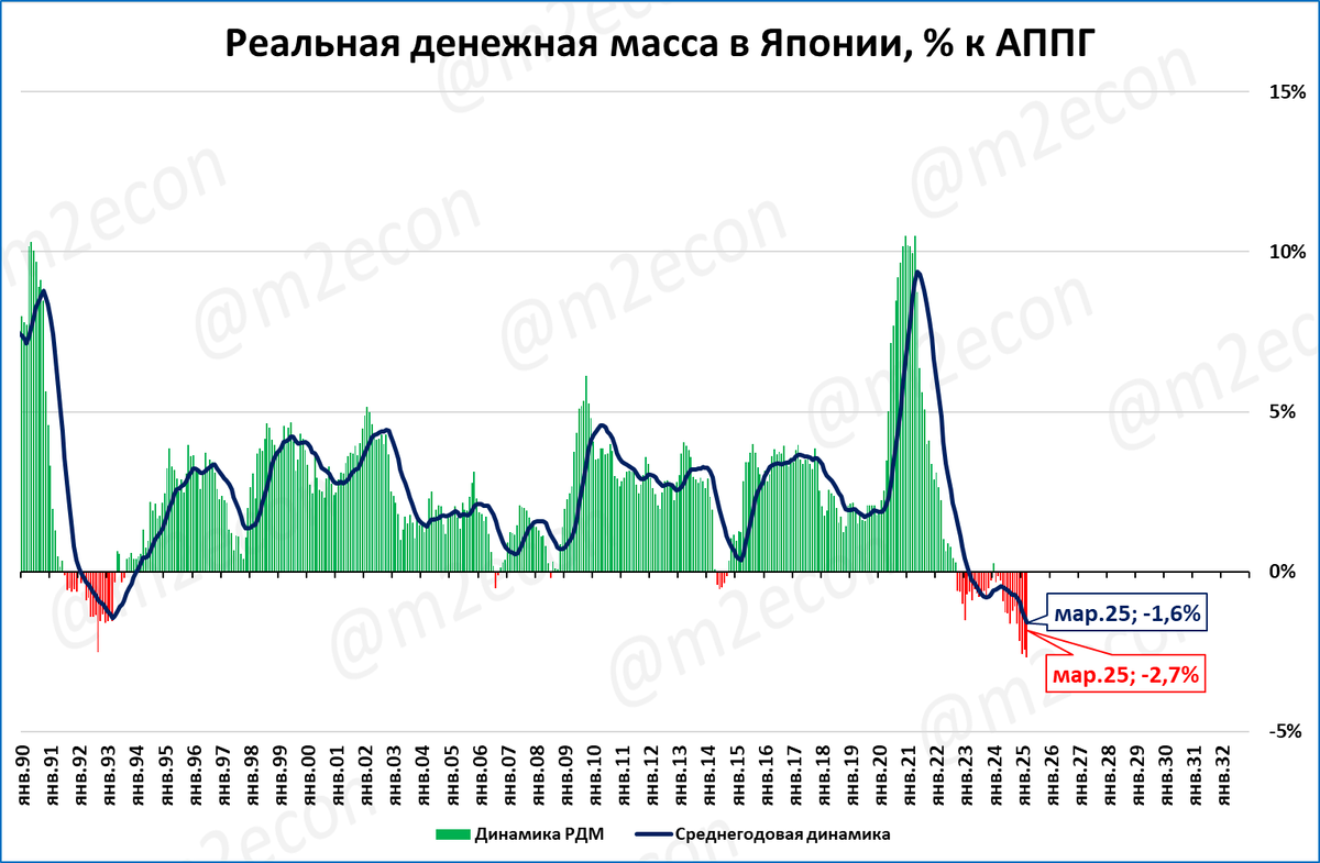 В Японии реальная денежная масса сжалась на 3,7% за год по итогам марта. Это максимальное падение как минимум за последние 30 лет. При этом ВВП продолжает расти: +1,7% в 1 квартале 2025 года.