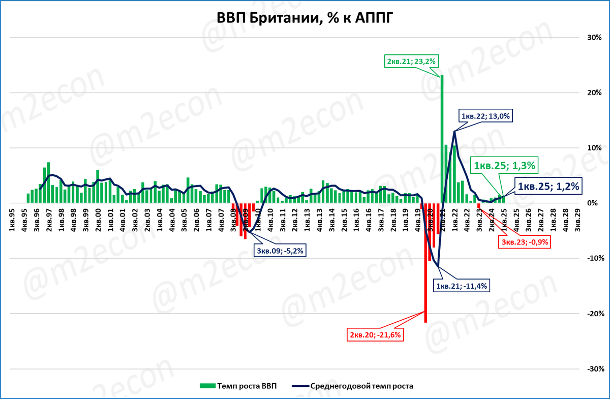 ВВП Британии в 1 квартале вырос на 1,2% к 1 кварталу 2024 года.