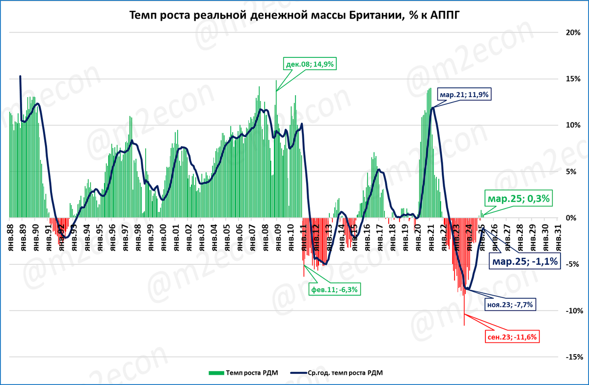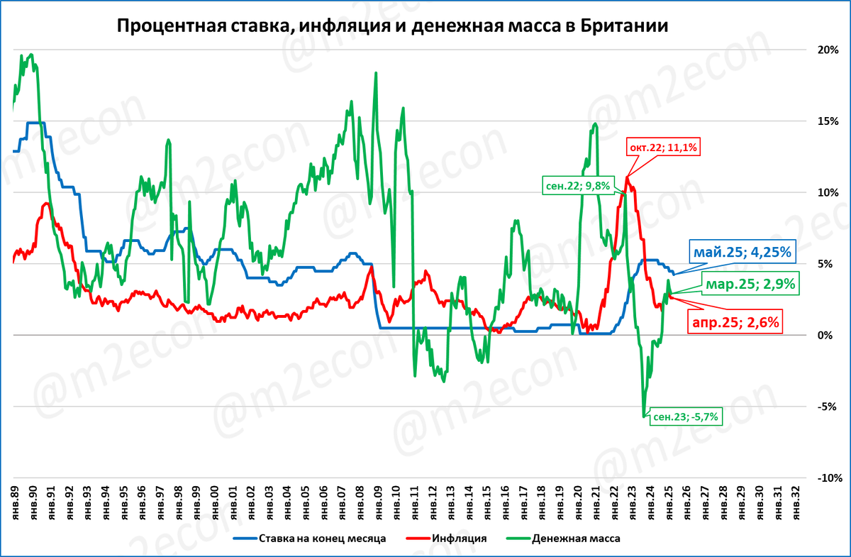 Январь стал первым месяцем с 2022 года, когда денежная масса в Британии росла быстрее цен. Банк Англии снизил ставку до 4,25% в мае.