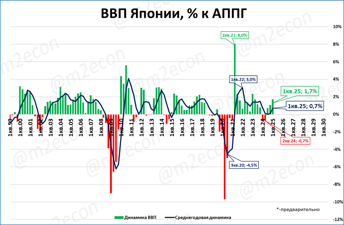 При этом в 1 квартале 2025 года ВВП Японии вырос на 1,7%.