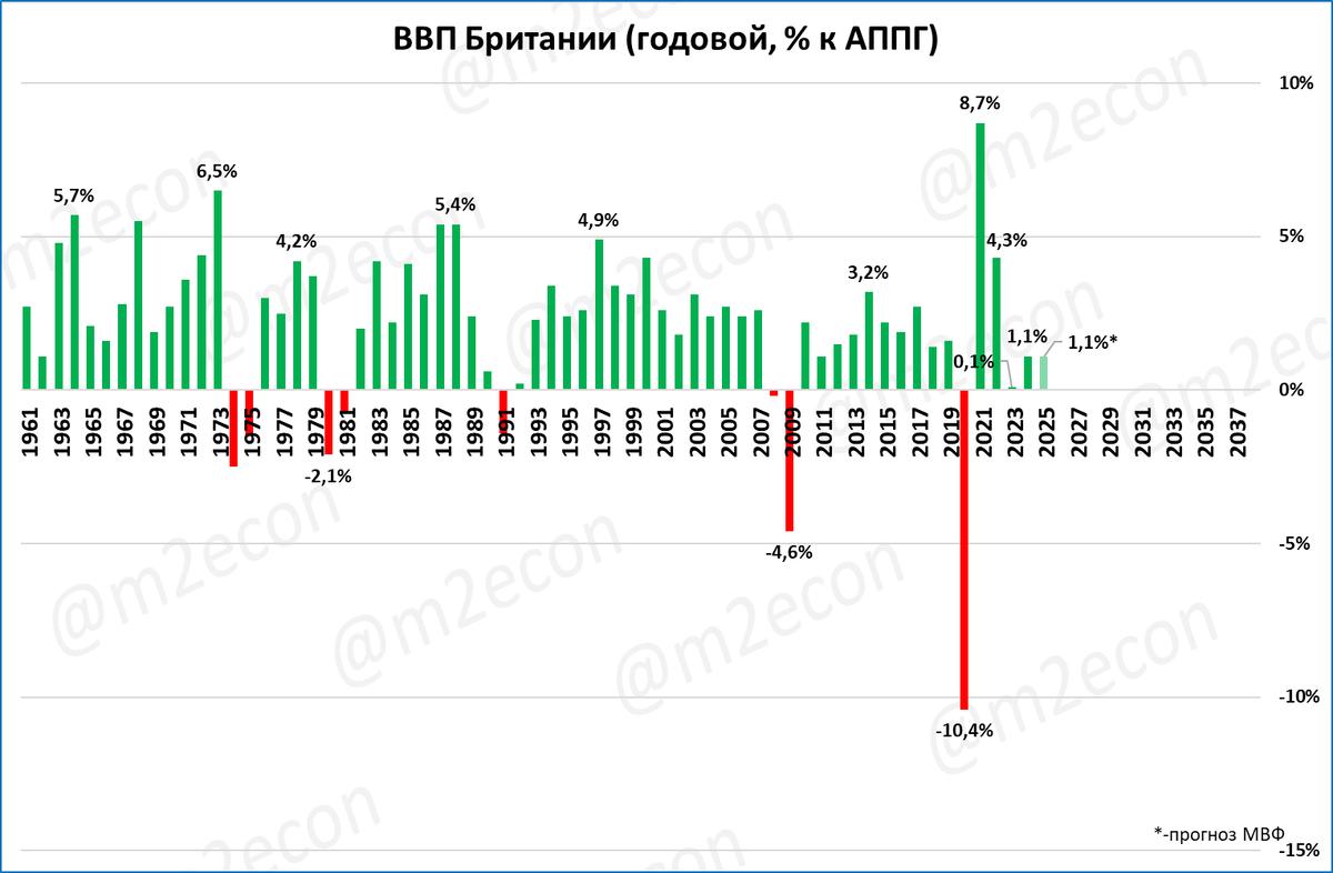 По прогнозу МВФ в 2025 году рост ВВП Британии сохранится на уровне 1,1%.